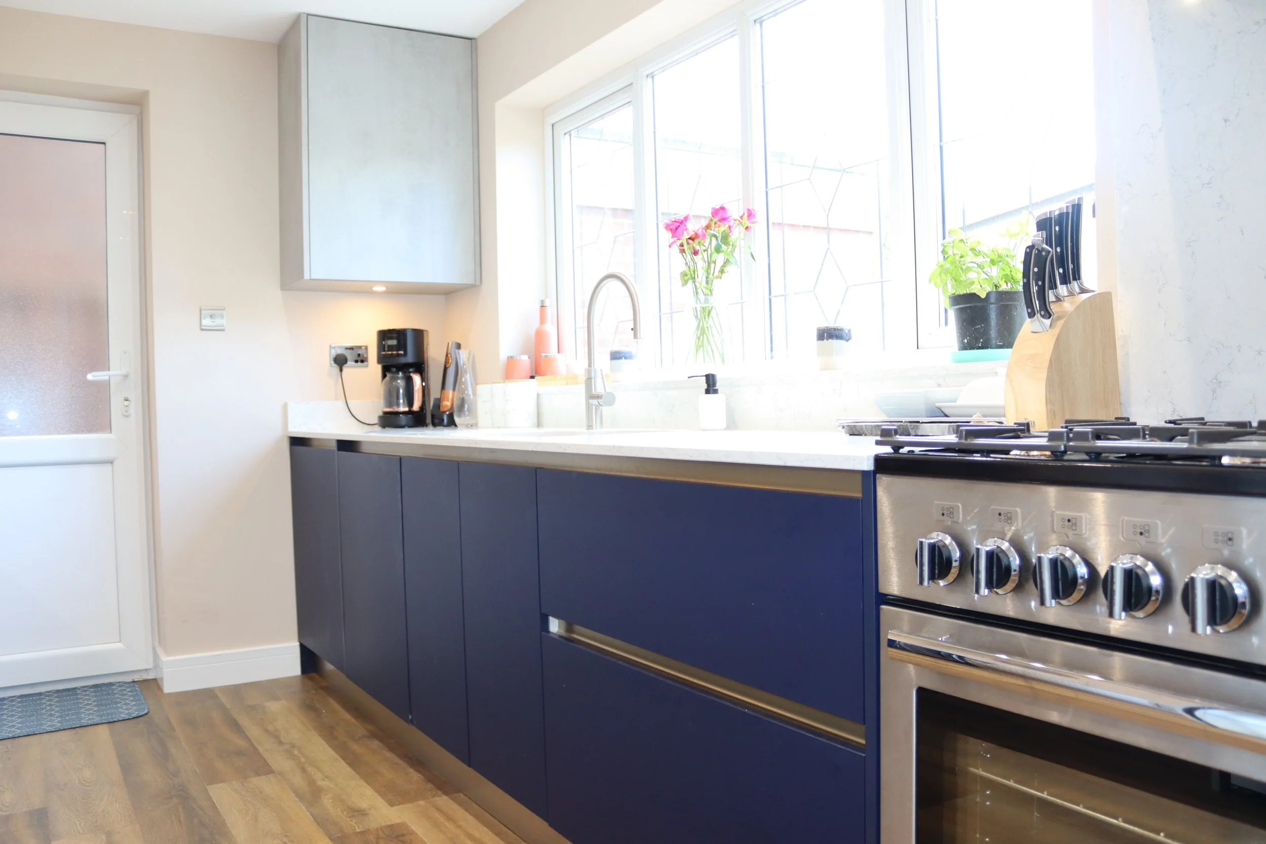 Silestone Quartz is used for the worktops using 20mm White Arabesque with drainer grooves, 100mm upstands, hob splashback & window cill. Further modern features include, a Franke Ariane 1.5 bowl stainless steel sink, Quooker Flex stainless steel tap with Quooker CUBE chilled & sparkling water option.